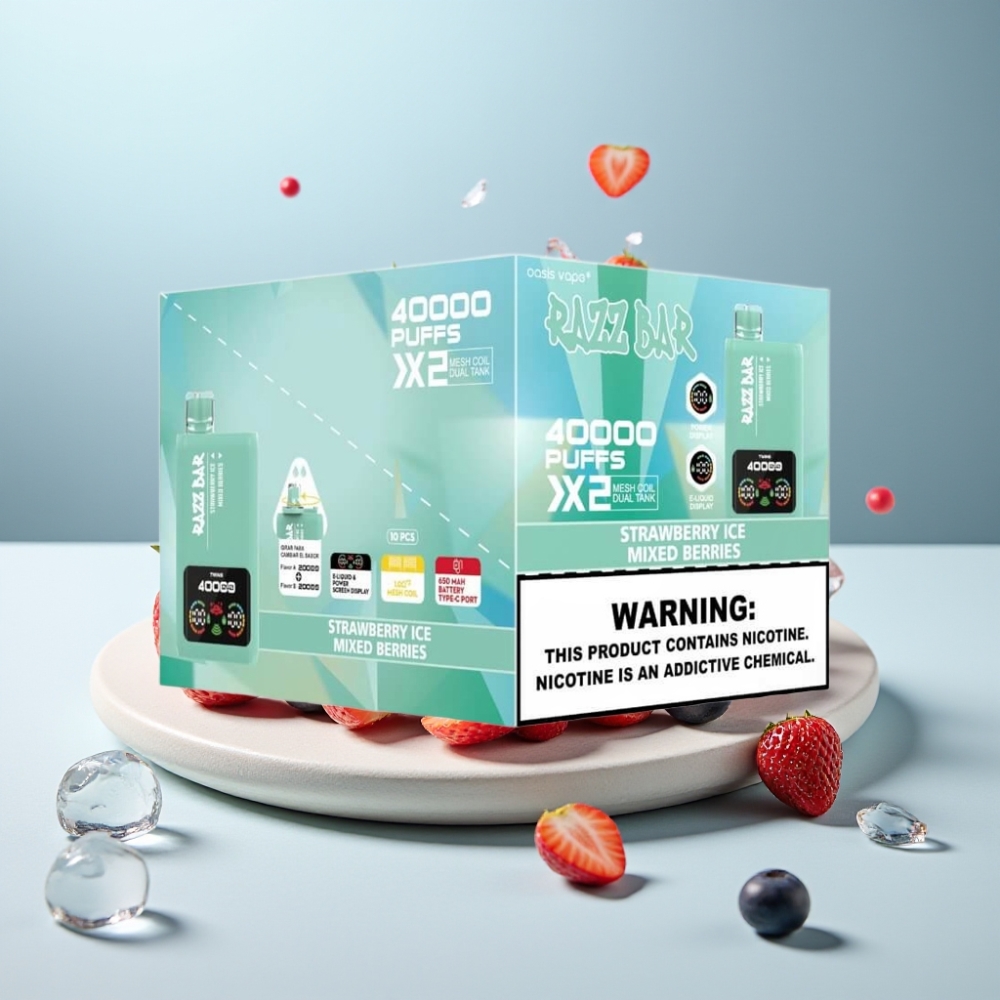 Razz Bar 40000 Puffs е висококачествено дишко устройство, предлагащо гъвкавост и дълготрайност. С нивата на никотин 2% и 5%, то отговаря на различни потребителски нужди – от безникотиново изживяване до замяна на цигари. Вградената 40ml е-течност и 40 000 затяжки гарантират продължителна употреба, а 650mAh батерията с Type-C зареждане осигурява бърза и удобна поддръжка. Иновативните Dual Mesh Coils подобряват вкуса и димопроизводството, а двойните вкусове и интелигентен дисплей правят употребата още по-персонализирана. За търговци на vape wholesale Bulgaria, Razz Bar предлага изгодни условия за едро с голям избор от популярни вкусове като Strawberry Ice, Watermelon Ice и Blue Razz Ice.